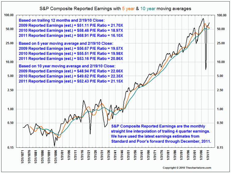 Stocks will, forever and always, follow earnings growth over the long-term. Earnings were decimated in 2008 as financial companies took massive writedowns on their bad bets and many went out of business altogether. Risk was drastically mispriced by financial firms and for their errors they suffered large losses. But, earnings of S&P 500 companies have rebounded sharply and are approaching all-time highs once again. This is the reason stocks have rallied. According to this chart, stocks are pricing 19 times 2010 earnings expectations. Granted, that is on the high side, but it's far from extreme.